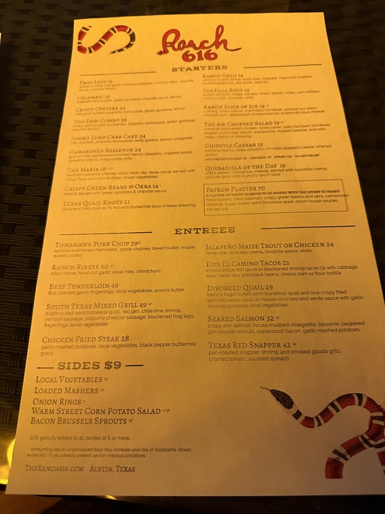 A PLATTER OF RANCH CLASSICS TO BE SERVED WITH THE INTENT TO SHARE! Texas Gulf fried oysters, Point Judith fried calamari, fried frog legs, camarones rellenos, Kevin’s sugar-cured semi-boneless grilled quail, Ranch house sauces. serves -
